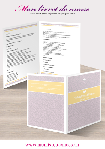 Ce livret de baptême est joliment illustré avec un fond floral uni et un ruban aux bordures dentelle. Une colombe et une croix apportent une touche finale classique raffinée. Créez en quelques minutes seulement tous vos livrets de baptême. Personnalisez ce modèle avec vos textes. Notre logiciel en ligne génèrera automatiquement un fichier PDF format A4 avec 1 livret. Il ne vous restera plus qu'à imprimer vos livrets et à les plier. Notre prix est unique : une fois votre produit acheté, vous pouvez imprimer chez vous autant d'exemplaires que vous le souhaitez !