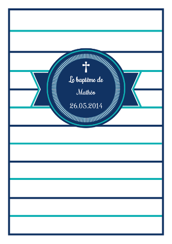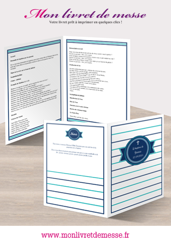 Ce livret de baptême est illustré sur le thème marin avec de jolies rayures bleu marine et bleu ciel. Créez en quelques minutes seulement tous vos livrets de baptême. Personnalisez ce modèle avec vos textes. Notre logiciel en ligne génèrera automatiquement un fichier PDF format A4 avec 1 livret. Il ne vous restera plus qu'à imprimer vos livrets et à les plier. Notre prix est unique : une fois votre produit acheté, vous pouvez imprimer chez vous autant d'exemplaires que vous le souhaitez !