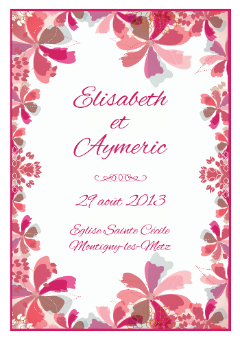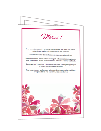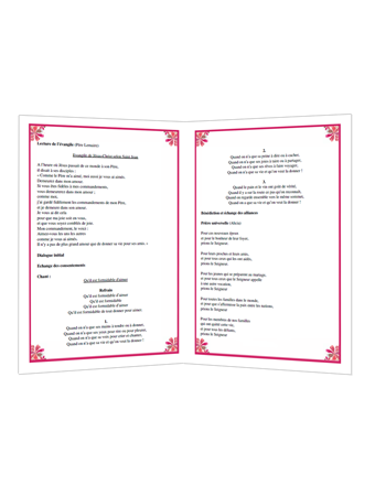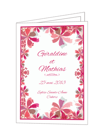 Ce livret de messe vous propose un thème floral luxuriant aux couleurs éclatantes : fushia, rose et parme. Convient pour un mariage sur le thème du printemps, des fleurs ou tropical.