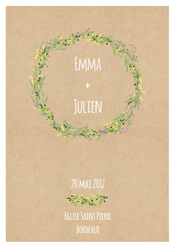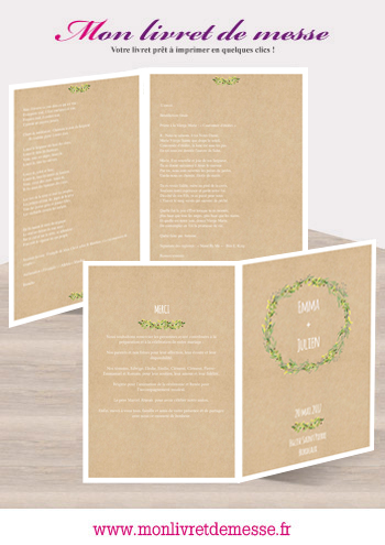 Ce livret de messe ou livret de cérémonie est composé d'une couronne de feuillage vert et jaune sur un fond kraft.