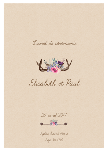Ce livret de messe ou livret de cérémonie est composé d'une illustration sur fond kraft avec des bois de cerf et une couronne de fleurs. Idéal pour un mariage sur le thème bohême ou champêtre.