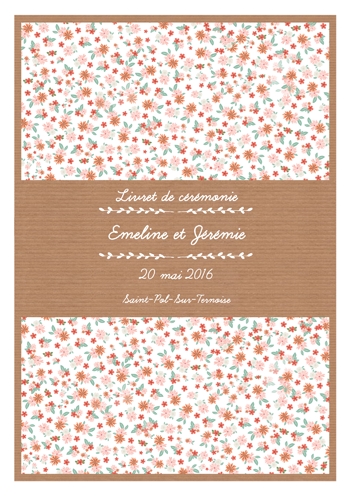 Ce livret messe est illustré avec un motif style Liberty et papier kraft. La police de caractère donne un effet "écrit à la main". Créez en quelques minutes seulement tous vos livrets de messe de mariage ou vos livrets de cérémonie. Personnalisez ce modèle avec vos textes. Notre logiciel en ligne génèrera automatiquement un fichier PDF format A4 avec 1 livret. Il ne vous restera plus qu'à imprimer vos livrets et à les plier. Notre prix est unique : une fois votre produit acheté, vous pouvez imprimer chez vous autant d'exemplaires que vous le souhaitez !