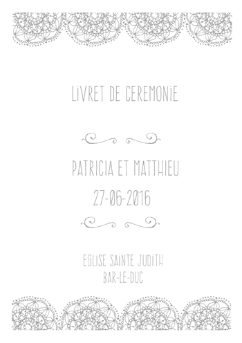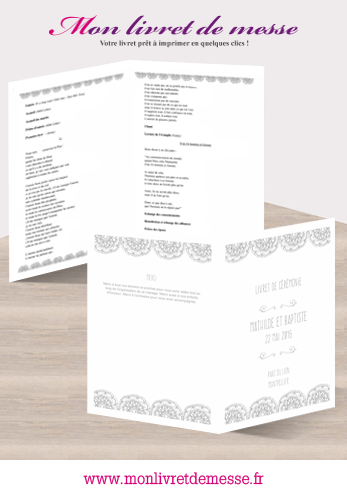 Ce livret de messe ou de cérémonie est idéal pour un mariage rustique, bohême, campagnard ou vintage. Le fond est blanc et une jolie frise avec des rosaces vient rehausser le tout, faisant penser à de la dentelle. Vous pouvez imprimer ce livret sur du papier de couleur ou du papier kraft selon vos envies.