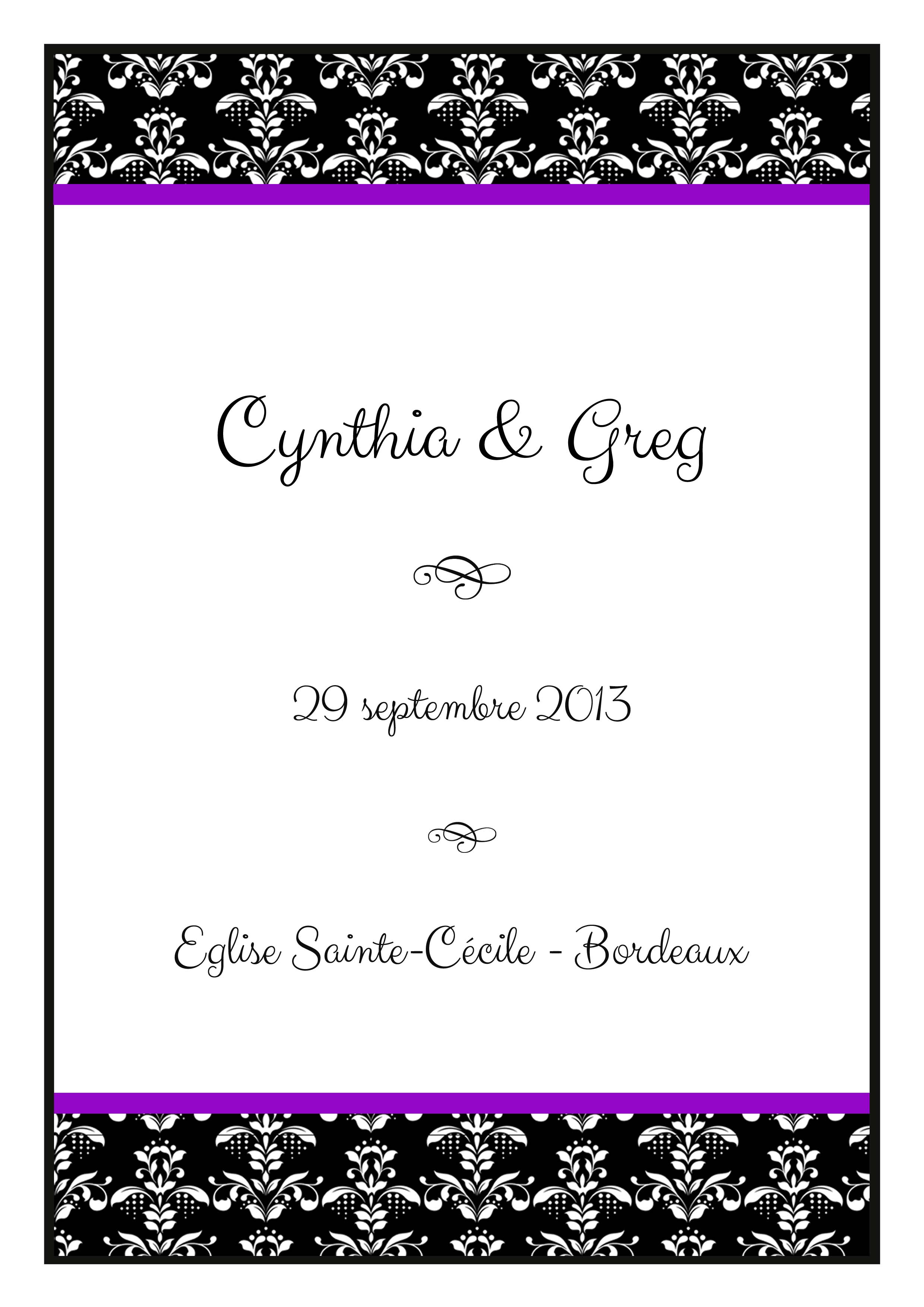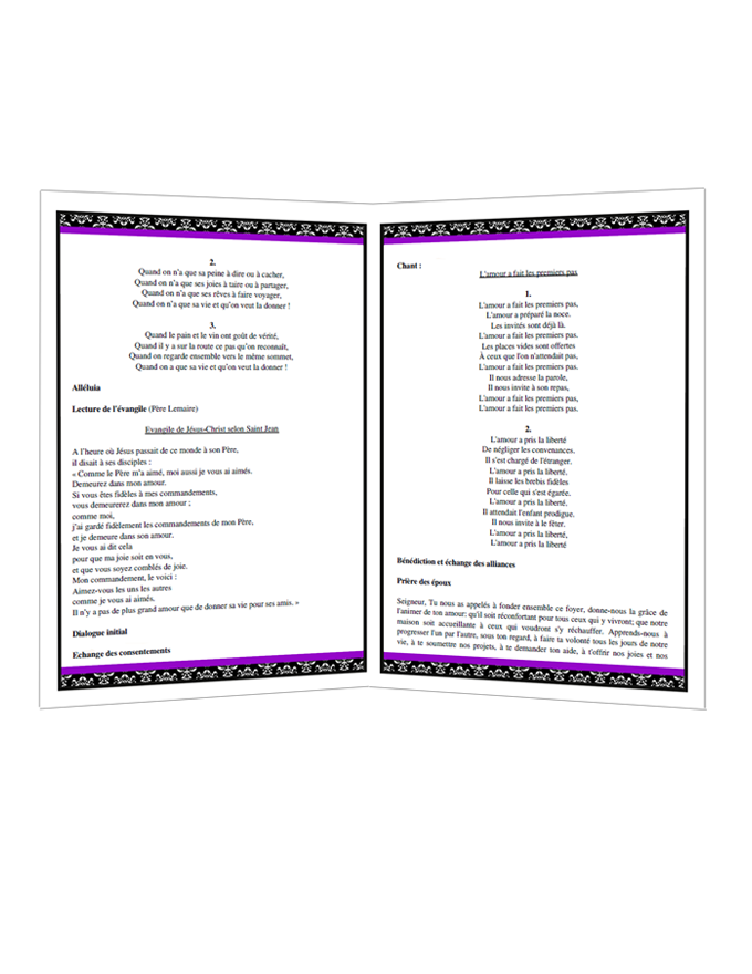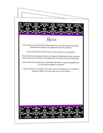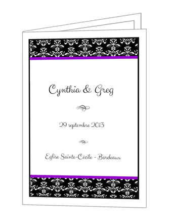 Ce livret de messe mariage contient un motif damas ainsi que deux fines bandes de couleur mauve.Il donnera un côté chic et glamour à votre livret.