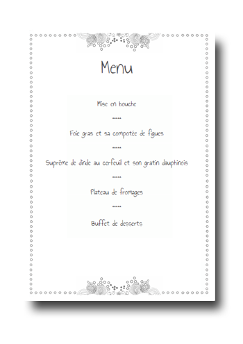 Créez en quelques minutes seulement tous vos menus pour votre repas de mariage. Personnalisez ce modèle en saisissant une fois votre menu. Notre logiciel en ligne génèrera automatiquement tous vos menus. Il ne vous restera plus qu'à les imprimer et à les découper. Nos menus sont livrés sous forme de fichier PDF et disponibles immédiatement après achat. Notre prix est forfaitaire : vous pouvez imprimer autant d'exemplaires du PDF que vous le souhaitez.