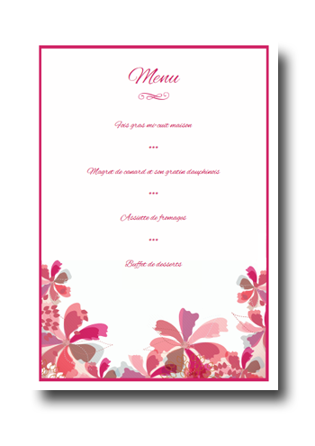 Créez en quelques minutes seulement tous vos menus pour votre repas de mariage. Personnalisez ce modèle en saisissant une fois votre menu. Notre logiciel en ligne génèrera automatiquement tous vos menus. Il ne vous restera plus qu'à les imprimer et à les découper. Nos menus sont livrés sous forme de fichier PDF et disponibles immédiatement après achat. Notre prix est forfaitaire : vous pouvez imprimer autant d'exemplaires du PDF que vous le souhaitez.