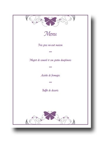 Créez en quelques minutes seulement tous vos menus pour votre repas de mariage. Personnalisez ce modèle en saisissant une fois votre menu. Notre logiciel en ligne génèrera automatiquement tous vos menus. Il ne vous restera plus qu'à les imprimer et à les découper. Nos menus sont livrés sous forme de fichier PDF et disponibles immédiatement après achat. Notre prix est forfaitaire : vous pouvez imprimer autant d'exemplaires du PDF que vous le souhaitez.