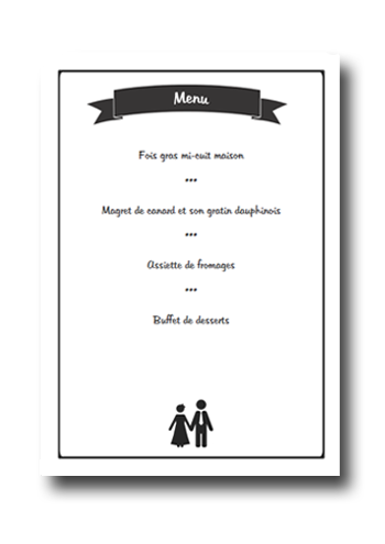 Créez en quelques minutes seulement tous vos menus pour votre repas de mariage. Personnalisez ce modèle en saisissant une fois votre menu. Notre logiciel en ligne génèrera automatiquement tous vos menus. Il ne vous restera plus qu'à les imprimer et à les découper. Nos menus sont livrés sous forme de fichier PDF et disponibles immédiatement après achat. Notre prix est forfaitaire : vous pouvez imprimer autant d'exemplaires du PDF que vous le souhaitez.